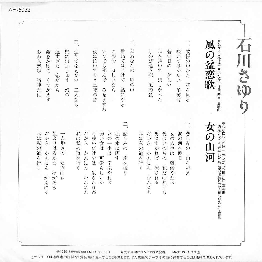 タイトル:風の盆恋歌 / 花ちりめん 主題歌 女の山河 (1989年)