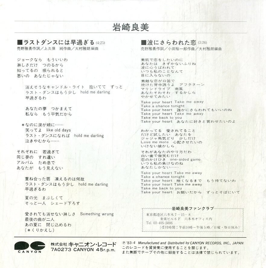 タイトル:ラストダンスには早過ぎる / 波にさらわれた(1983年)