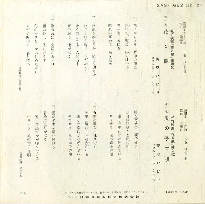 コメント:松竹映画「花と龍」主題歌・挿入歌