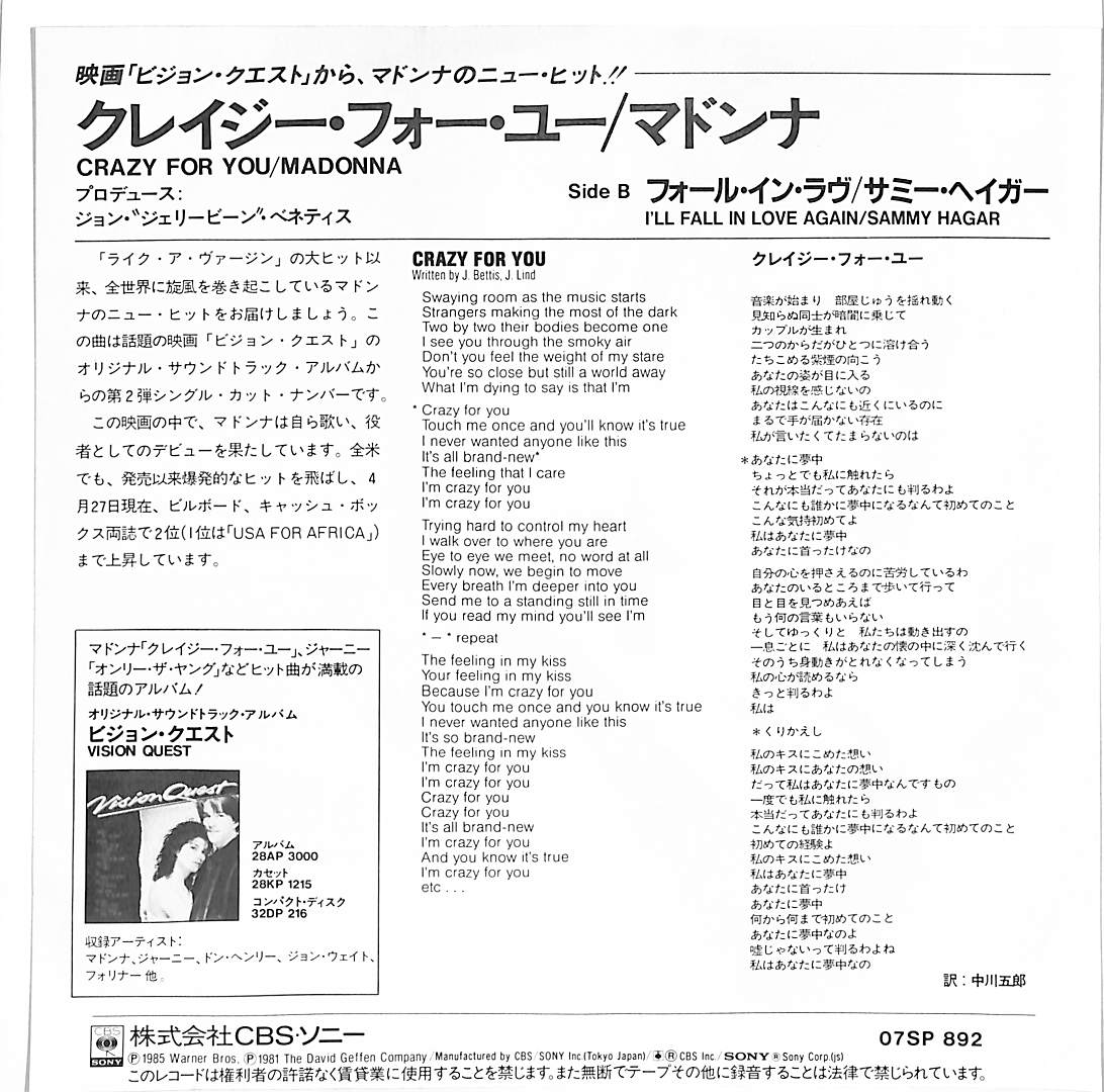 タイトル:Crazy For You / Ill Fall In Love Again (1985年・シンセポップ)