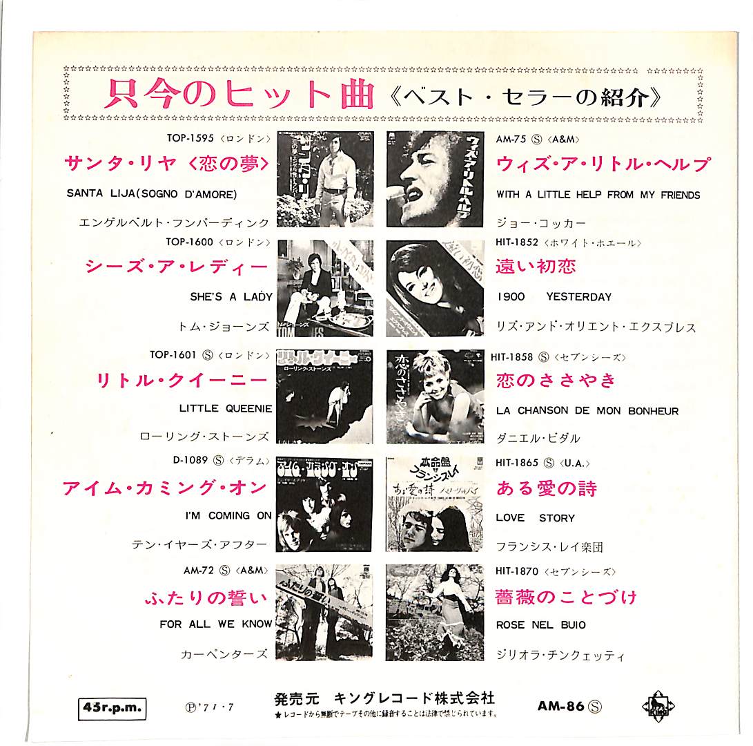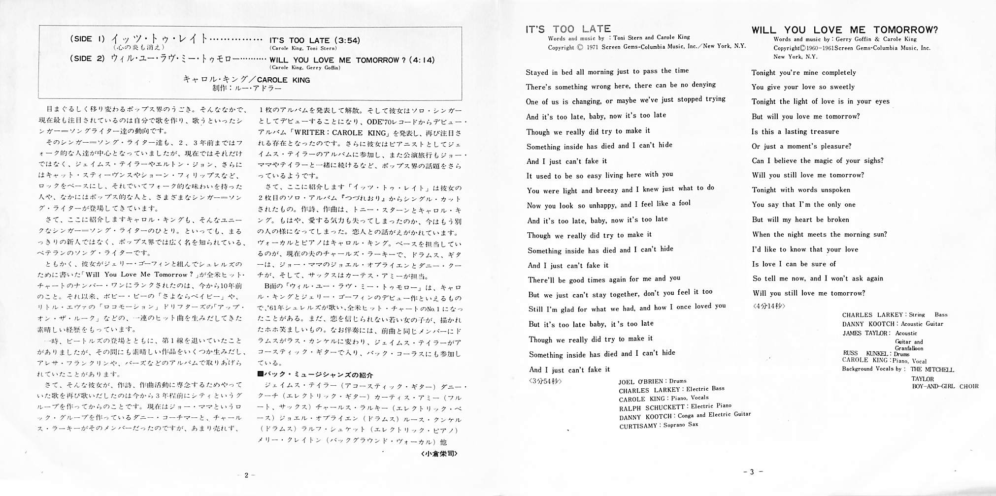 タイトル:心の炎も消え Its Too Late / Will You Love Me Tomorrow?(1971年・フォークロック・猫ジャケ・ネコード)