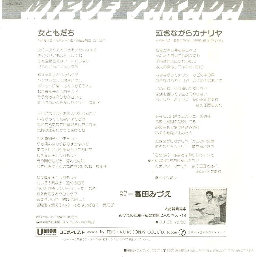 タイトル:女ともだち / 泣きながらカナリヤ(筒美京平作曲)