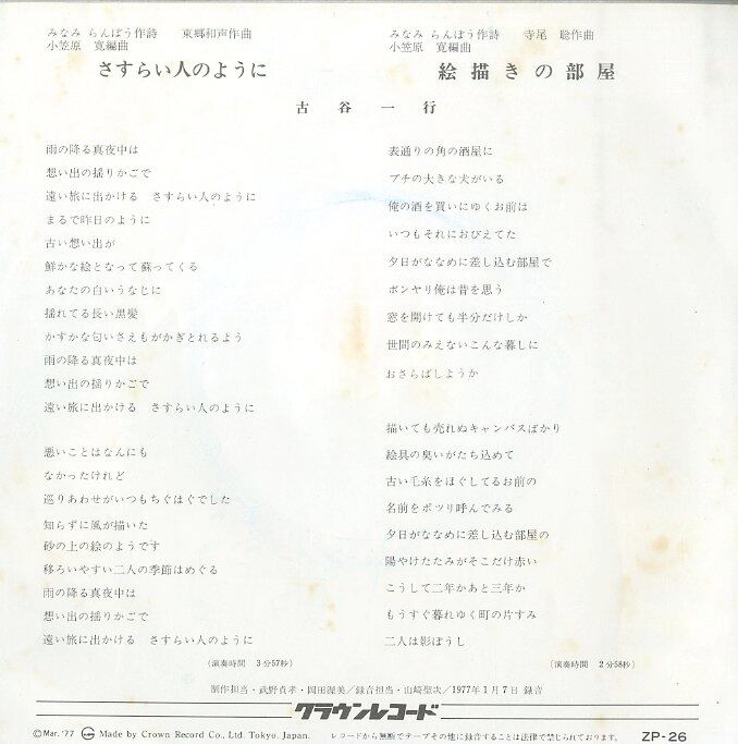 タイトル:さすらい人のように / 絵描きの部屋(1977年・小笠原寛編曲・東郷和声・寺尾聡作曲)