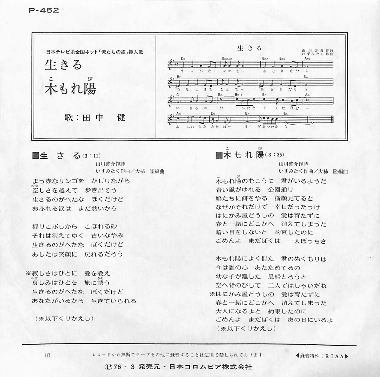 タイトル:俺たちの旅 挿入歌 生きる / 木もれ陽 (1976年・サントラ)