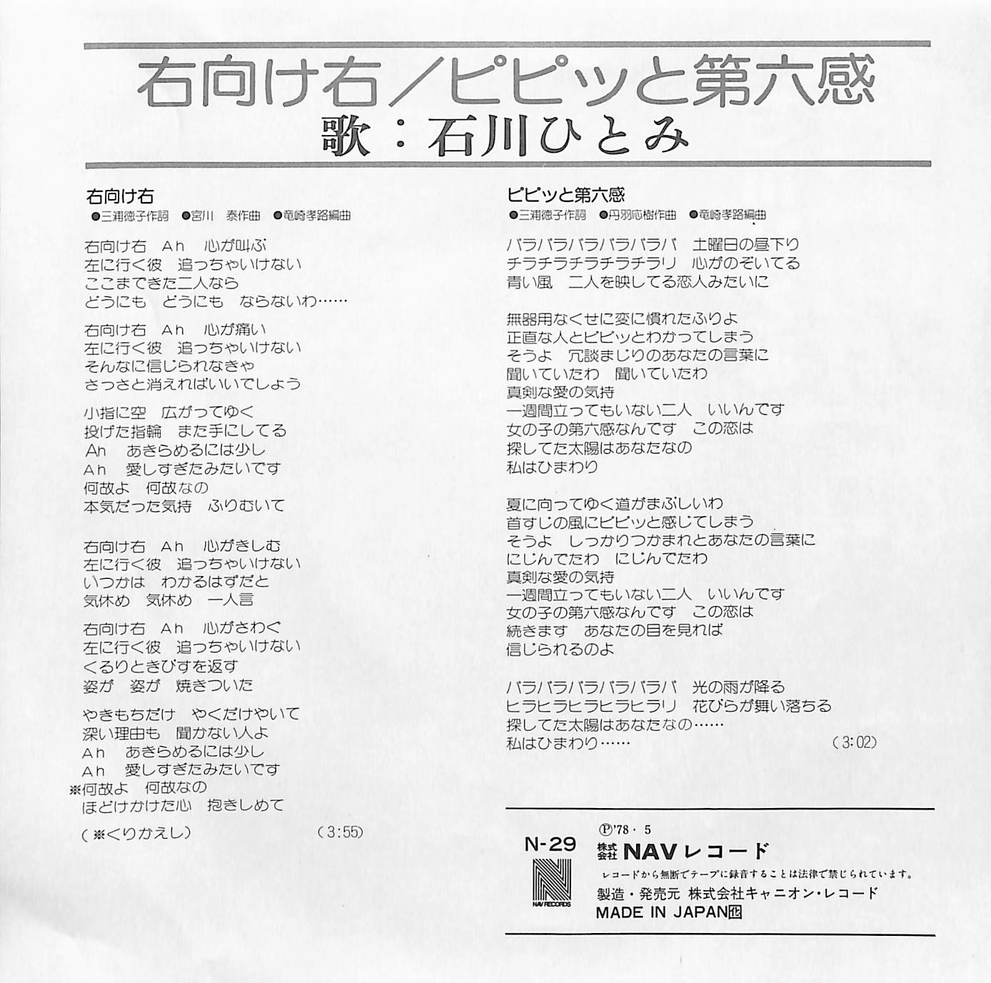 タイトル:右向け右 / ピピッと第六感(1978年)