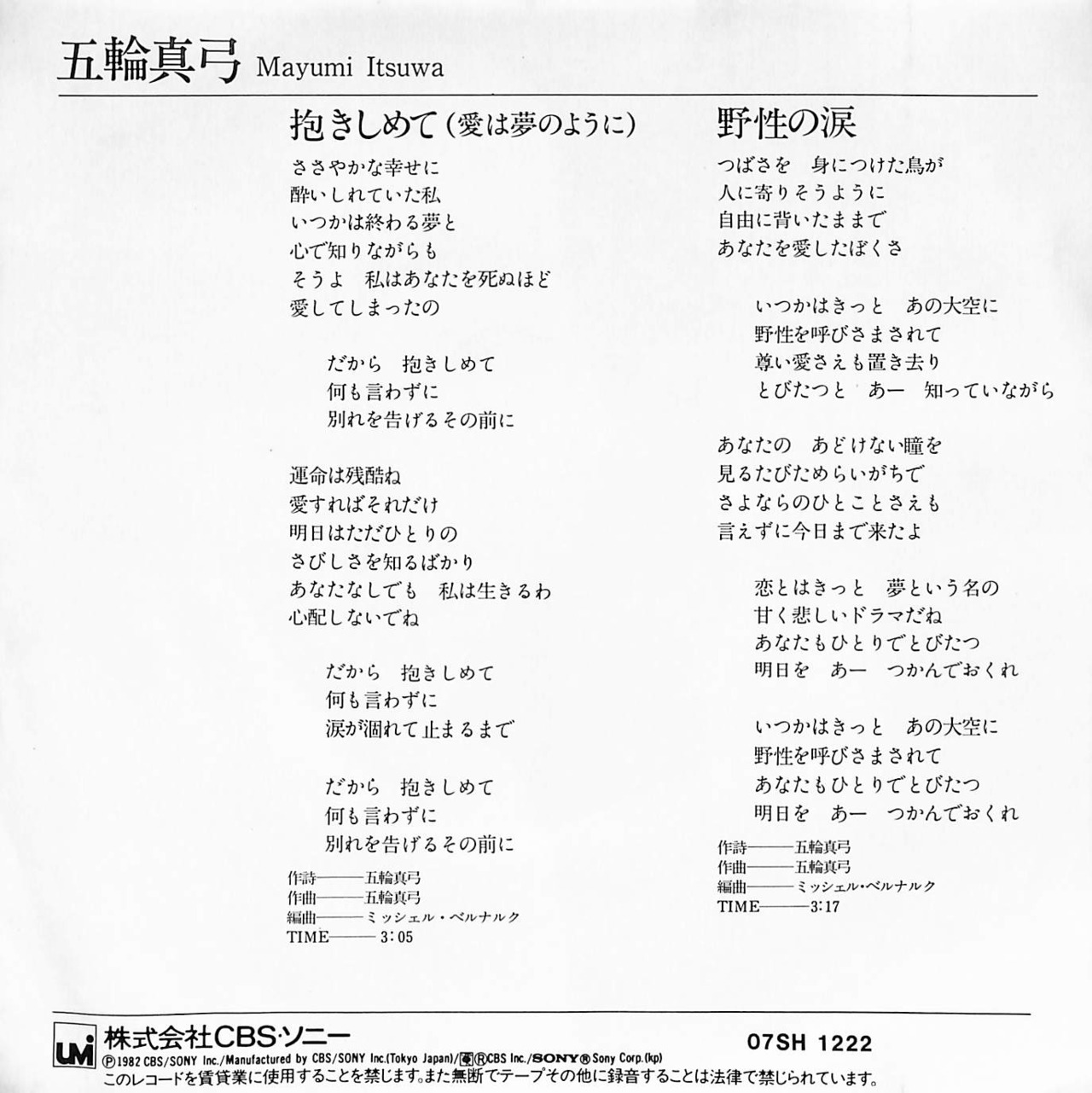 タイトル:抱きしめて(愛は夢のように) / 野性の涙(1982年)