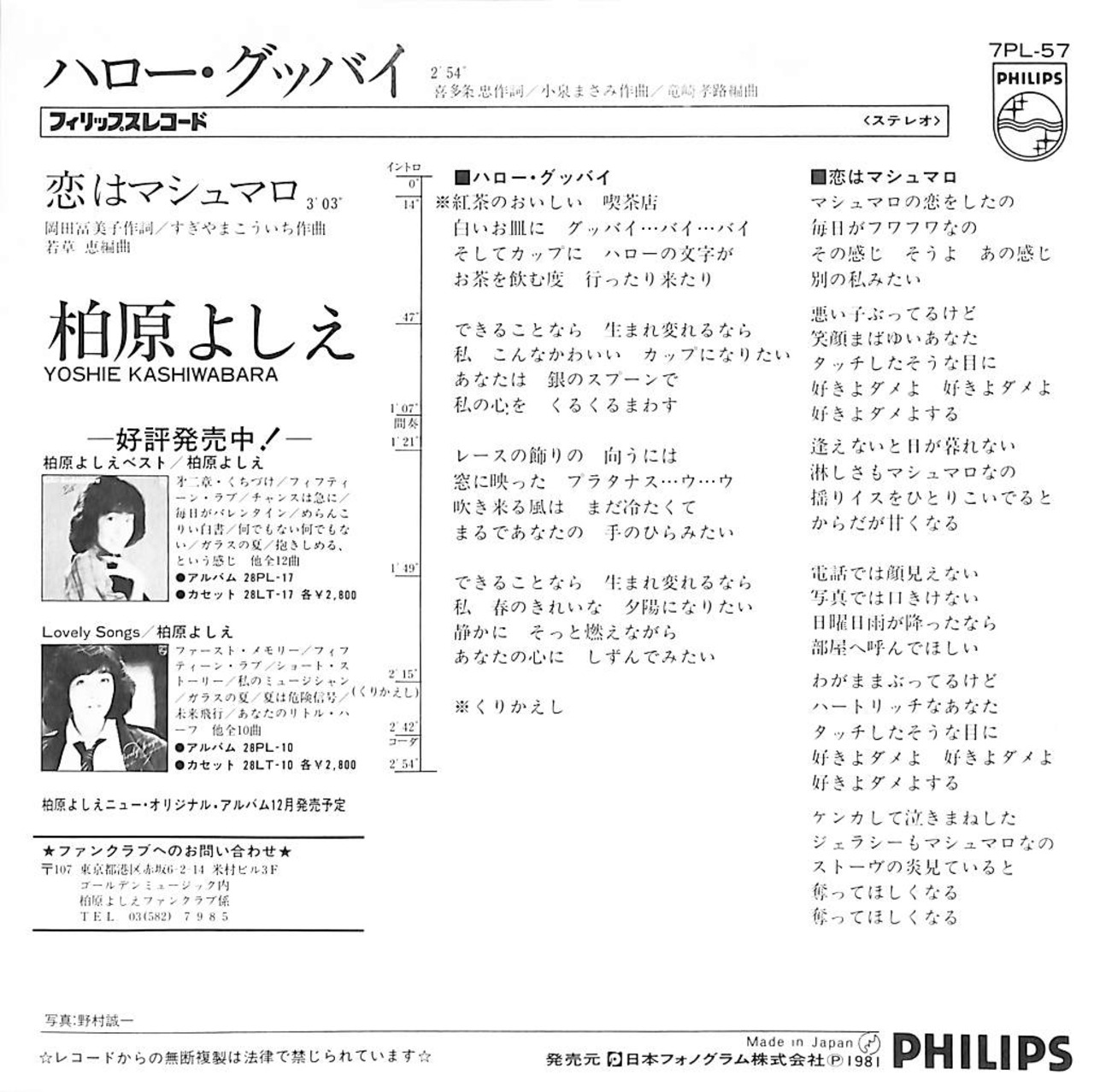 タイトル:ハロー・グッバイ / 恋はマシュマロ(1981年・B面すぎやまこういち作曲・若草恵編曲)