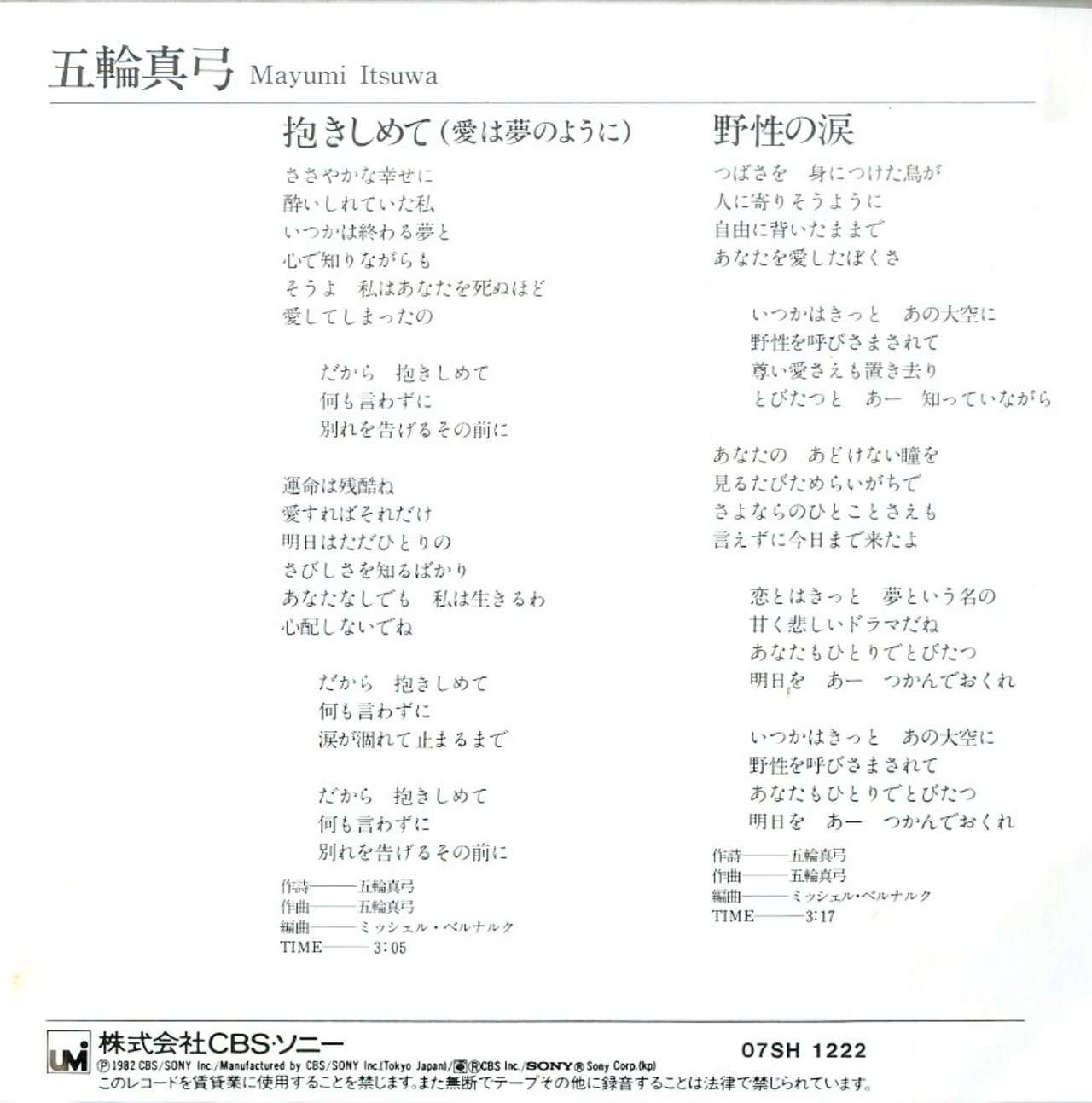 五輪真弓 / 抱きしめて(愛は夢のように) / 野性の涙